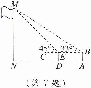 7. 某校数学兴趣小组开展综合实践活动——测量校园内旗杆的高度.如图,已知测倾器AB的高度为1.5米,在测点A处安置测倾器,测得旗杆顶部点M的仰角∠MBC= 33°,在与点A相距4.5米的点D处安置测倾器,测得点M的仰角∠MEC= 45°(点A,D,N在同一条水平线上,且点M,N,D,A,B,E,C都在同一竖直平面内,点B,E,C在同一直线上),则旗杆顶部离地面的高度MN为