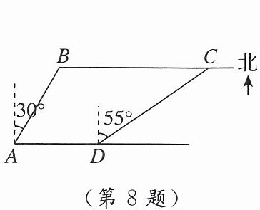 8. 如图,小亮为测量某铁桥的长度,乘车在与该铁桥平行且处于同一水平面的一段东西走向的公路上行驶时,在A处发现桥的起点B在A点的北偏东30°的方向上,并测得AB= 160米,当车前进146米到达D处时,测得桥的终点C在D点的北偏东55°的方向上,则该桥的长度BC约为
