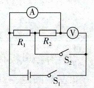 10.如图所示电路,电源电压保持不变.闭合开关$S_1$和$S_2,$电压表示数为4.5V,电流表示数为0.3A.将电压表和电流表互换位置,闭合$S_1,$断开$S_2,$电流表示数为0.1A.下列说法中(