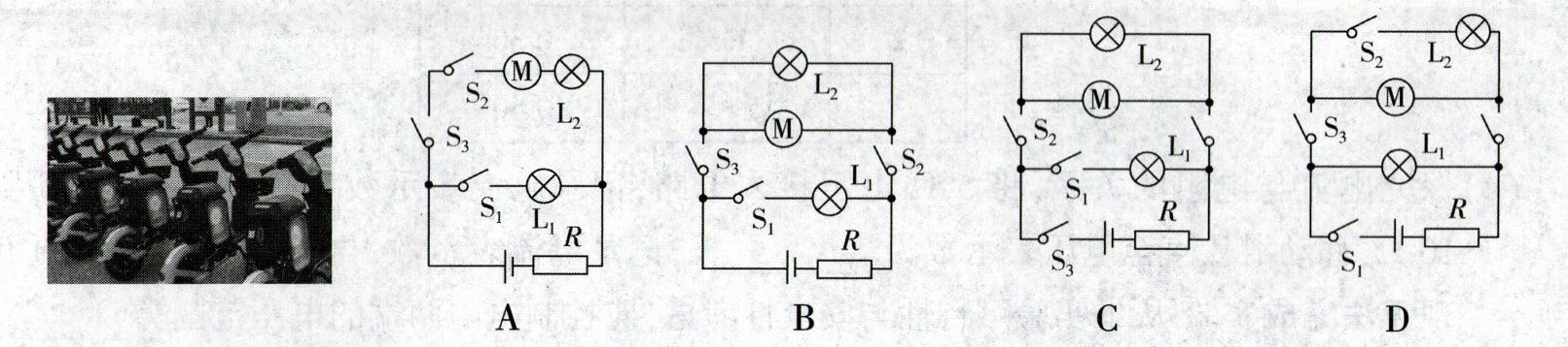 6.(2024·潍坊)共享电动助力单车极大方便人们的出行.如图为某助力单车,使用前先摇晃车把检查电量,此时开关$S_1$闭合,只有电量指示灯$L_1$亮起;确认电量充足后扫码开锁,此时开关$S_2$闭合,日间行车灯$L_2$亮起,电动机M启动,且日间行车灯$L_2$损坏时电动机M可正常工作;助力单车在规定区域内,开关$S_3$始终处于闭合状态,如果驶离规定区域,开关$S_3$自动断开,电动机M、行车灯$L_2$均无法工作,指示灯$L_1$可正常工作.下列电路设计符合要求的是(