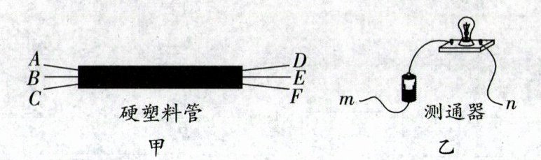 7.如图甲所示,一根电缆内穿有三根完全相同的电线,用图乙的测通器可辨别哪两个线头为同一根电线的两端.连接A和C,将测通器的m接在D端,当n接F端时灯发光,当n接E端时灯不发光,由此可确定为同一导线两端的是(