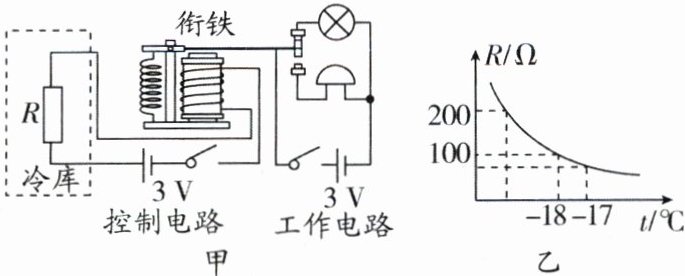 11. 海鲜保存常要求温度低于-18℃.小明为海鲜市场的冷库设计了温度自动报警器,其原理如图甲所示.控制电路和工作电路的电源电压均保持3V不变,电磁铁线圈电阻忽略不计,乙图为热敏电阻R随温度变化的图像.冷库温度等于或高于-18℃时,工作电路报警.下列说法正确的是 (