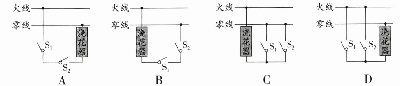 5. (2023·湖北)小明设计了一种晚上自动给花草浇水电路.光控开关$S_1$在天黑时闭合,湿敏开关$S_2$在土壤过于干燥时闭合.浇花器仅在土壤过于干燥的夜间才开始工作,对花草进行浇水.下列电路既满足上述条件,又符合安全用电原则的是 (