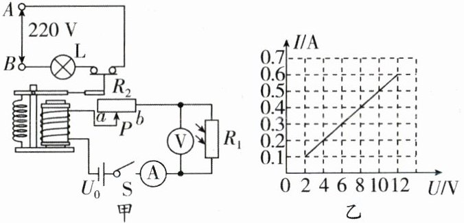 7. 小明用光敏电阻设计了一种“智能家居照明灯”电路,该照明灯实现在天暗时自动点亮,天亮时自动熄灭.如图甲所示$,R_1$为光敏电阻,阻值随光照强度变化而变化$,R_2$为滑动变阻器,电源电压U₀恒定,保持光照强度不变,闭合开关S后,滑片P由a端向b端移动过程中,电流表示数I与电压表示数U的关系如图乙所示(电磁继电器线圈的电阻不计),下列说法正确的是 (