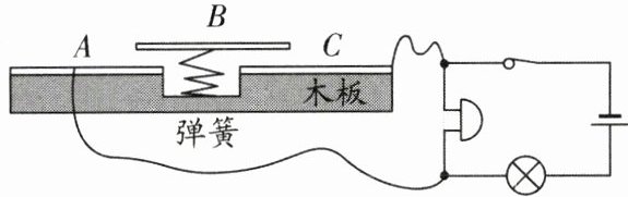 物品被搬离 开关 解析:当物品被搬离时,金属片 B 在弹簧作用下与金属片 A、C 分开,电路中电铃有电流通过,发声报警,金属片 B 和弹簧可以控制电铃的通断,相当于开关