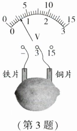 3. 在柠檬上相隔一定距离分别插入铜片和铁片,就制成了“柠檬电池”.将铜片、铁片与调零后的电压表相连,如图所示.下列说法错误的是 (