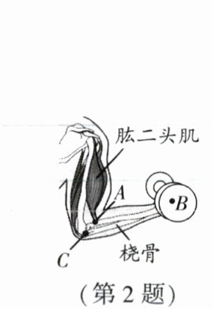 2. (2024·青岛)如图所示,小明用手提起哑铃,这一动作从生物学的视角,可以认为桡骨在肱二头肌的牵引下绕着肘关节转动;从物理学的视角,可以认为是一个杠杆在工作.下列说法正确的是 (