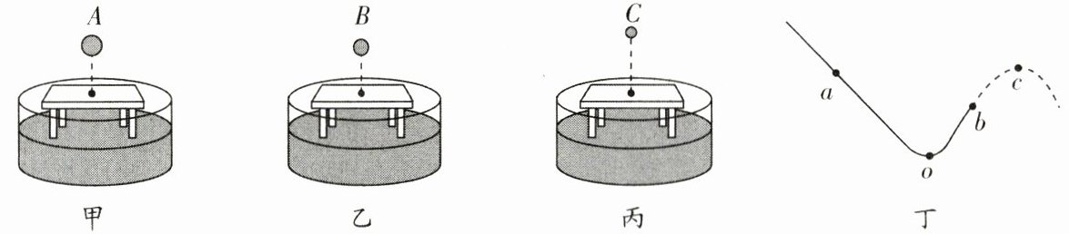 (4)小明又利用金属球做了图丁实验,将球放在左侧轨道上放手后沿轨道运动,图中虚线为球离开轨道 b 点后的部分运动轨迹,a、c 两点等高.则金属球在 a、c 两点的速度大小关系是$v_{a}$