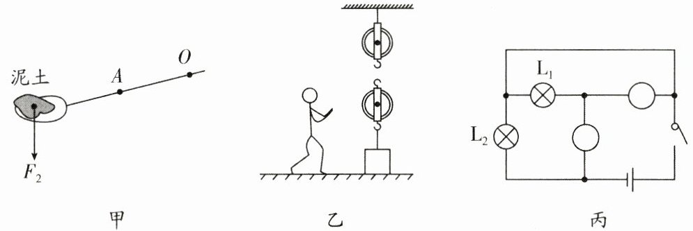 (1)将铁锹视为杠杆,O 为支点,请在图甲中画出在 A 处施加最小动力 F 的示意图及阻力臂 l;