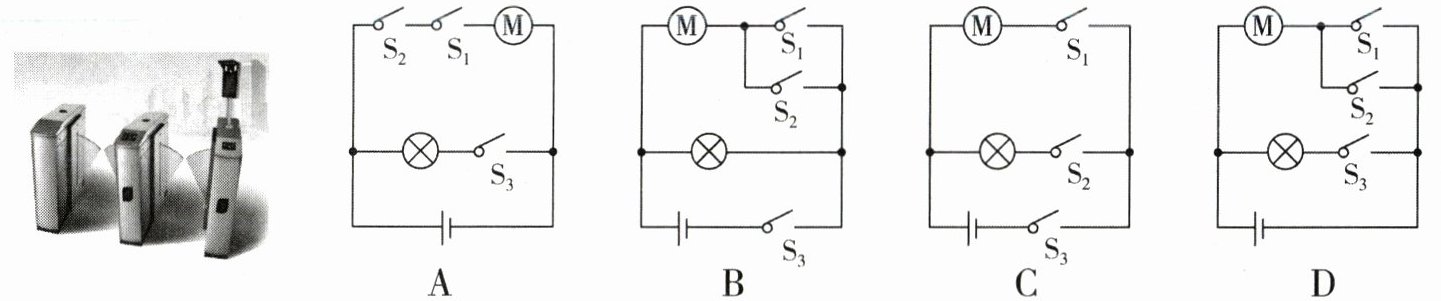 D 解析:A.$S_{1}$、$S_{2}$两个开关都闭合,“人脸识别”与“刷卡识别”同时匹配成功时,闸门才会打开,夜晚光线较暗时,人靠近闸机(光控开关$S_{3}$自动闭合),摄像头开启补光灯,故A不符合题意;B.光控开关$S_{3}$闭合,再闭合$S_{1}$或$S_{2}$闸门才会打开,故B不符合题意;C.光控开关$S_{3}$闭合,$S_{2}$闭合时进行补光,$S_{1}$闭合时闸门打开,故C不符合题意;D.当人脸识别(开关$S_{1}$闭合)或刷卡识别(开关$S_{2}$闭合)匹配成功时,电动机均能打开,这说明两个开关互不影响,是并联的,然后与电动机串联;在光线较暗时,光控开关$S_{3}$自动闭合,补光灯发光,这说明灯泡能独立工作,所以灯泡与电动机是并联的,故D符合题意。故选D。