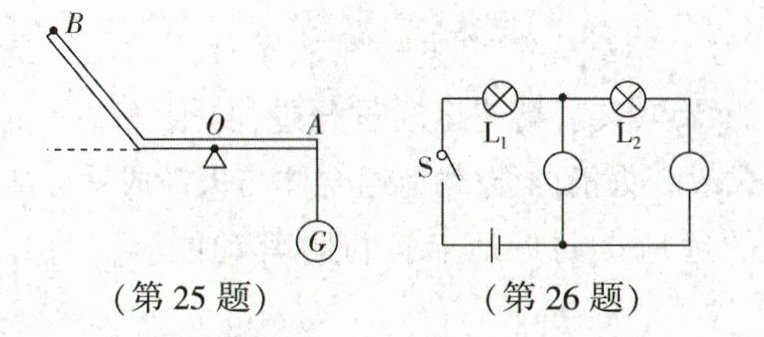 25.如图所示,在杠杆 AOB 的 A 端挂一重物 G,要使杠杆在如图所示的位置平衡,请画出在杠杆上施加的最小动力$F_{1}与力臂l_{1}及阻力F_{2}$的示意图.