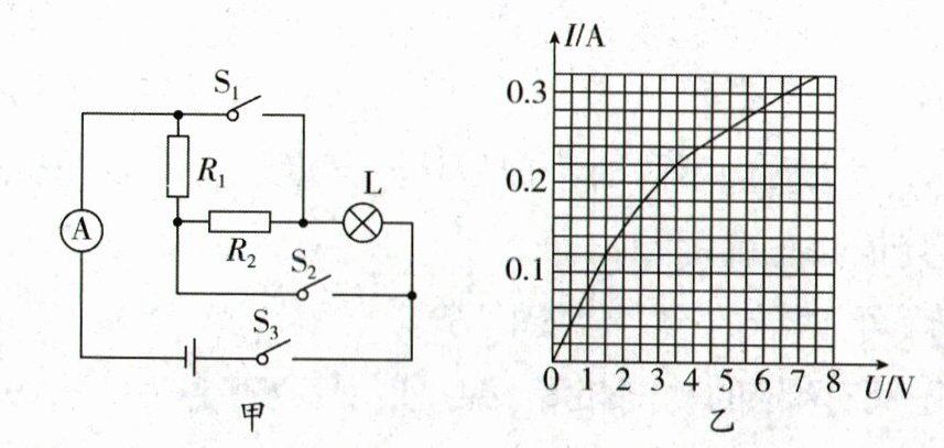 31.在如图甲所示的电路中,电源电压恒定,$R_{1}$、$R_{2}$为定值电阻,已知电灯 L 的电流随其两端电压变化的图像如图乙所示.当开关$S_{1}$、$S_{3}$闭合,$S_{2}$断开时,电流表的示数为 0.26A;当开关$S_{2}$、$S_{3}$闭合,$S_{1}$断开时,电流表的示数为 1.25A;当开关$S_{3}$闭合,$S_{1}$、$S_{2}$断开时,电流表的示数为 0.2A.求: