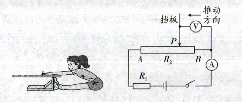 12. 小林自制了一个坐位体前屈项目测试仪,原理如图所示,电源电压恒为 10 V,电阻丝 $ R_2 $ 粗细均匀,总长度为 30 cm,$ R_1 = 50Ω $.闭合开关,挡板 P 在 B 端时,坐位体前屈成绩为 0 cm,电流表示数为 0.05 A;挡板 P 在 A 端时,坐位体前屈成绩为 30 cm.下列说法正确的是(