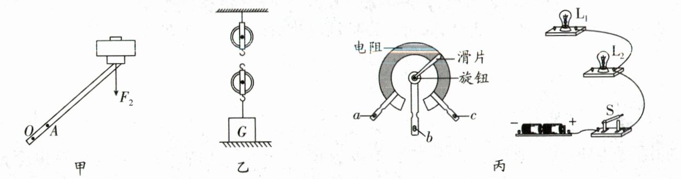(3) 图丙是“子母调光灯”的内部结构示意图,a、b、c 是它的三个接线柱,要求:闭合开关 S,逆时针转动旋钮带动滑片时,灯 $ L_1 $ 变亮,$ L_2 $ 变暗,请按要求将电路连接完整.