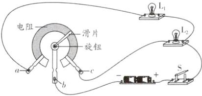 (3)由题意可知,L1、L2互不影响,应并联接入电路.当闭合开关,逆时针转动旋钮带动滑片时,灯L1变亮,这意味着通过L1的电流增大,根据欧姆定律,电压不变时,电阻变小、电流增大,所以L1应与a连接,灯L2变暗,说明通过L2的电流减小,即电阻增大,所以L2应与c连接,中间b与电源负极连接形成回路.