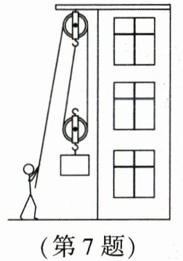 7. (2024·聊城)建筑工地上,工人用如图所示的装置将重为$300N的建材从地面匀速运送到离地面8m$的高处,所用时间为$40s$.已知动滑轮重为$40N$,不计滑轮组的绳重和摩擦,下列说法正确的是
