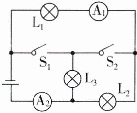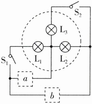 ②“a”接$S_3,“b”$接电源,三个开关都闭合时,灯$L_2、$$L_3$并联