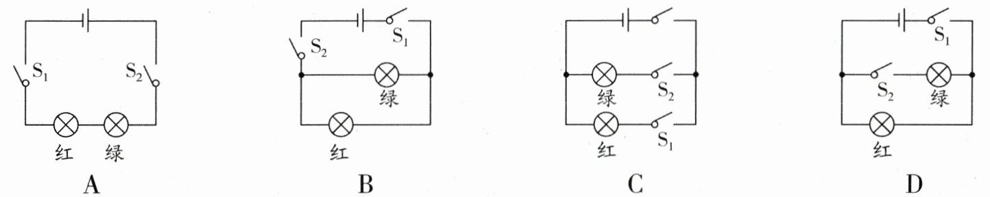 6. (2024·淄博)为停车场设计“车位占用”提醒模拟电路,要求车位被占用时,该车位上方只有红色指示灯亮;车位未被占用时,上方只有绿色指示灯亮.下列电路能实现上述要求的是 (