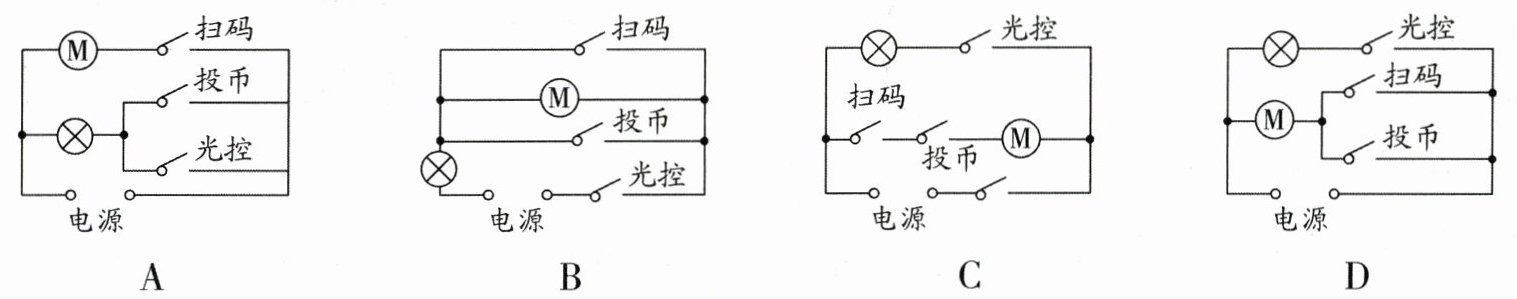 8. (2024·广安)某学校为了培养学生的科学素养,开展了STEM科创教育,在此期间,科创小组自制了“冰淇淋自动售货机”.该作品可以通过扫码(该开关闭合)或投币(该开关闭合)完成自动出售服务;当光线较暗时,光控开关闭合,还可以提供照明.下列电路设计符合该要求的是 (