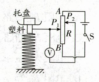 25. (12分)如图所示为某种电子秤的原理示意图,AB是粗细均匀的电阻棒,每厘米长度的电阻值为25Ω,总长度为20cm,两边分别有$P_{1}$、$P_{2}$两个金属滑动触头,触头在电阻棒上滑动时能保持接触良好且没有摩擦,与$P_{1}$连接的金属棒左端和绝缘塑料固定.已知弹簧的弹力F与弹簧的压缩量x的关系是$F= 300x$(其中弹力的单位是牛顿,压缩量的单位是米),托盘中未放物体时,$P_{1}$在电阻棒上端A点下方1cm处,电源电压为20V,托盘上未放物体时,电压表读数应为零,g取10N/kg,问: