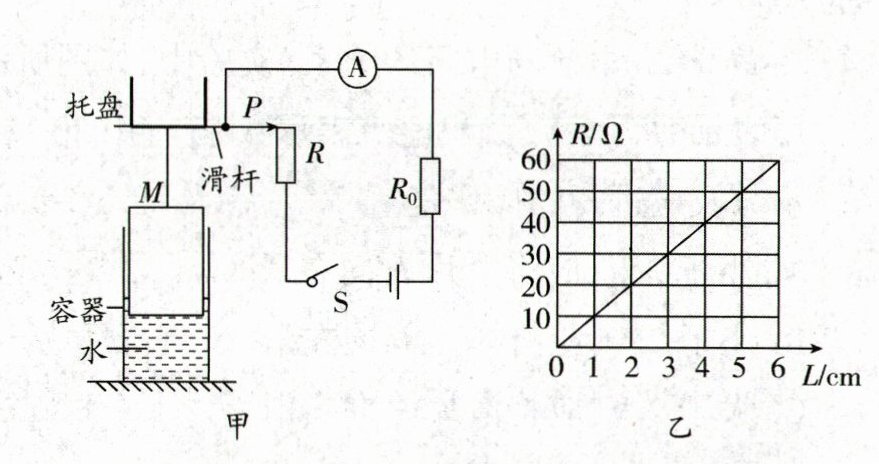 24. (15 分)(2024·南充)科创小组设计利用电流表测量质量的装置如图甲。现截取适当长度的电阻片 R(它的阻值随长度 L 的变化图像如图乙)作为滑动变阻器接入电路。图甲中,电源电压 6V 恒定不变,电流表量程为 0~0.6A。当滑片 P 在最下端时,电流表示数为 0.6A。装置中托盘与圆柱形实心塑料浮筒 M 通过硬质绝缘细杆固定连接,整体漂浮在装有足够深水的柱形薄壁容器中,且只能竖直移动。托盘的质量为 0.27kg;M 高 22cm,底面积为$ 300cm^2,$质量为 0.33kg;容器的底面积为$ 400cm^2,$托盘通过滑杆带动滑片 P 上下移动。托盘中未放物体时,调节水量,使滑片 P 正好位于 R 最上端。托盘中放入物体 A 时,M 刚好浸没,滑片 P 正好位于 R 最下端(g 取 10N/kg、ρ₍水$₎ = 1.0×10^3kg/m^3,$不计滑片、滑杆、细杆的质量,忽略摩擦阻力,工作中水不溢出)。求: