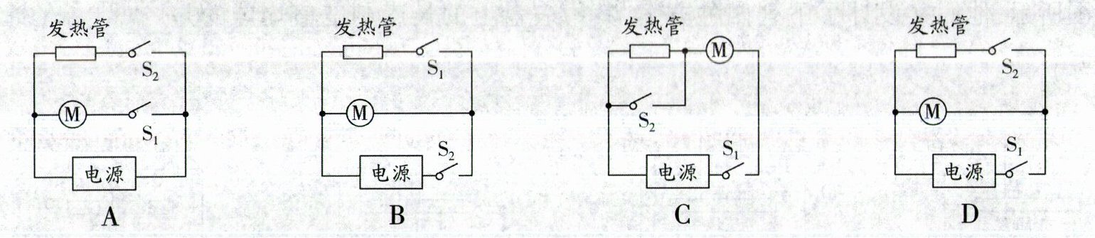 4. (2024·内蒙古)某同学手中的实验器材有发热管、电动机、开关 $ S_1 $ 和 $ S_2 $、电源和导线若干,想设计一个电路来实现:同时闭合 $ S_1 $ 和 $ S_2 $ 产生热风;仅闭合 $ S_1 $ 产生冷风;仅闭合 $ S_2 $ 不发热也不吹风.下列电路图符合要求的是 (