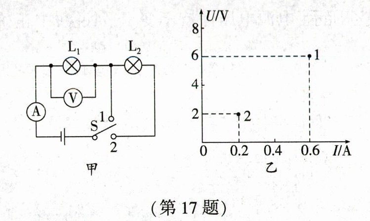 17. 如图甲所示,当开关 $ S $ 由接点 1 转到接点 2 时,电压表示数变化如图乙所示,则灯泡 $ L_2 $ 两端的电压是