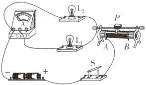 解析:电流表测灯L₁ 的电流,所以电流表应与L₁ 串联.电流大约0.5A,电流表选用小量程;向A端移动滑动变阻器的滑片P,两灯亮度都变,故滑动变阻器应串联在干路中;两灯均变亮,故变阻器连入的电阻变小,所以应将A接线柱接入电路中.开关串联 在干路中控制整个电路。