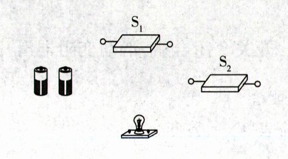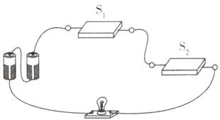 22. (2 分)有人发明了“感应照孔门把手”,只有在夜间且有人摸门把手时,锁孔旁的灯才亮,从而方便夜间开锁,它利用感应开关 $ S_1 $(有人摸门把手时,$ S_1 $ 闭合;无人摸门把手时,$ S_1 $ 断开)以及光敏开关 $ S_2 $(天暗时 $ S_2 $ 闭合,天亮时 $ S_2 $ 断开)控制电路,达到目的.请根据上述描述,完成电路连接.