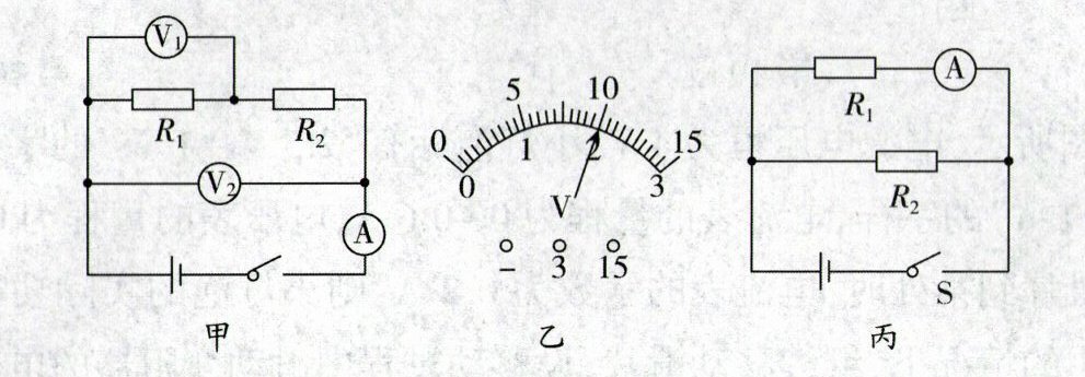 解:甲图中,$R_1$与$R_2$串联,$V_1$测$R_1$电压,$V_2$测总电压。