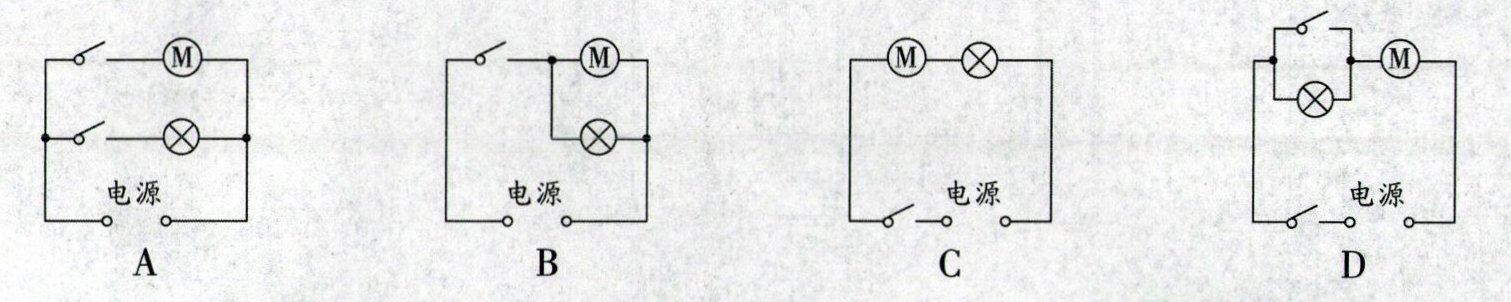 A 解析:在抽油烟机中,照明灯和电动机既可以同时工作又可以独立工作,这说明它们之间的工作状态互不影响,根据并联电路的特点,各支路的用电器都可以独立工作,互不影响,因此照明灯和电动机应该并联。同时,开关应控制其对应的用电器,所以照明灯由其对应的开关控制,电动机由其对应的开关控制,且照明灯和电动机并联后再接入电路。故选A。