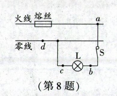 8. 如图所示的家庭电路中,正常发光的灯L突然熄灭,电工用测电笔分别测a、b、c、d四点,发现a、b两点氖管都发光,c、d两点氖管都不发光.若电路只有一处故障,则可能是 (