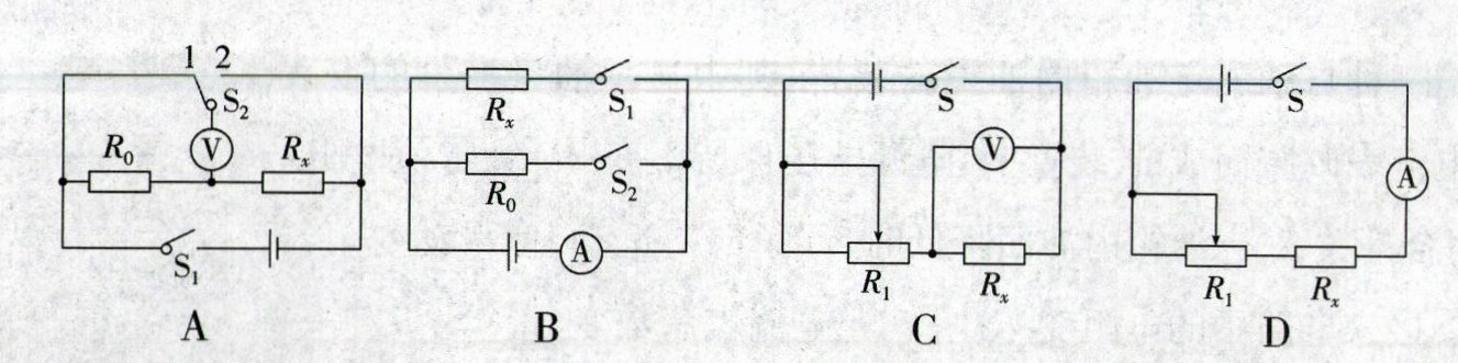 A 解析:A.图中S₂置于1时电压表上端接线柱接正极,置于2时接负极,导致电压表正负接线柱接反,无法测量Rₓ的阻值,故A符合题意;B.分别单独闭合S₁、S₂,测出通过Rₓ、R₀电流为I₁、I₂,根据欧姆定律可得电源电压为U = I₁Rₓ = I₂R₀,则电阻Rₓ阻值Rₓ = I₂R₀/I₁,故B能测出;C.闭合开关,将R₁置于最右端,R₁接入阻值为0,读出电源电压为U,再滑到最左端,测出Rₓ两端电压为Uₓ,根据欧姆定律可得Uₓ/Rₓ = (U - Uₓ)/R₁,则电阻Rₓ阻值Rₓ = UₓR₁/(U - Uₓ),故C能测出;D.闭合开关,将R₁置于最右端,R₁接入阻值为0,电路中只有Rₓ,读出电流表为I₁,再滑到最左端,两电阻串联,测出总电流I₂,根据欧姆定律可得I₁Rₓ = I₂(Rₓ + R₁),则电阻Rₓ阻值Rₓ = I₂R₁/(I₁ - I₂),故D能测出。故选A。