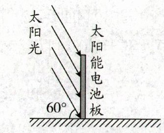 (3)已知在一段时间内,垂直于太阳光的$1m^2$面积上每秒接收的太阳能为500J,如图所示,太阳光与水平面夹角为60°,面积为$4m^2$的太阳能电池板竖直放置.太阳能电池板将太阳能直接转化为电能的效率为20%.求1min内通过该太阳能电池板获得的电能.