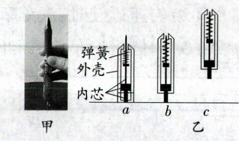 9.如图甲所示是我们常见的按压式圆珠笔.如图乙,小明先将笔倒立向下按压然后放手,笔将向上弹起一定的高度,整个过程可分为三个阶段:①下压:把笔竖直倒立于水平硬桌面,下压外壳使其下端接触桌面(位置a);②释放:由静止释放,外壳竖直上升,弹簧恢复到原长(位置b);③跳起:笔继续上升到离桌面2cm的最高处(位置c)开始下落.若不计一切摩擦,下列说法正确的是 (