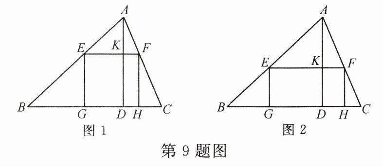 9. 一块材料的形状为锐角三角形ABC,边BC= 90 mm,高线AD= 60 mm,把它加工成正方形零件,如图1,使正方形的一边在BC上,其余两个顶点分别在AB,AC上.