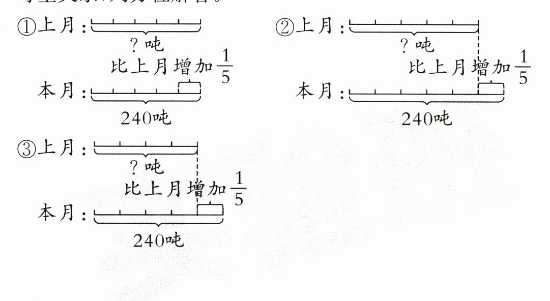 2. 某车间本月生产钢铁240吨,比上月增加了$\frac {1}{5}$,这个车间上月生产钢铁多少吨?下面哪幅图正确表达了题目的意思?写出等量关系,列方程解答。
