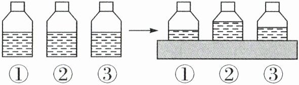 7. 有三个形状、大小都一样的瓶子,里面装有同样多的水,在每个瓶子里各放一块石头后,水面不再一样高(如下图)。(