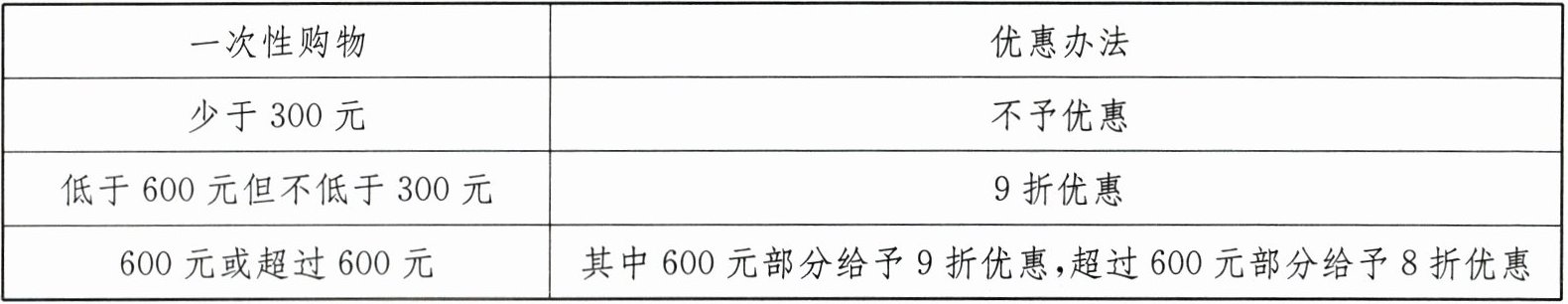 (2)$0.9x$ $0.8x+60$ [解析]当$300\leqslant x<600$时,他实际付款$0.9x$元;当$x\geqslant600$时,他实际付款$0.9×600+0.8(x-600)=0.8x+60$(元).