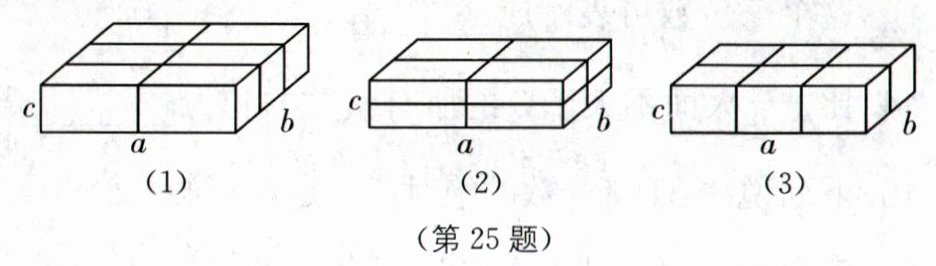 25. (10分)(2025·无锡惠山区期中)小颖为妈妈准备了一份生日礼物,礼物外包装盒为长方体形状,长、宽、高分别为a,b,c($a>b>c$),小颖决定在包装盒外用丝带打包装饰,她发现,可以用如图所示的三种打包方式,所需丝带的长度分别为$l_{1},l_{2},l_{3}$(不计打结处丝带长度).