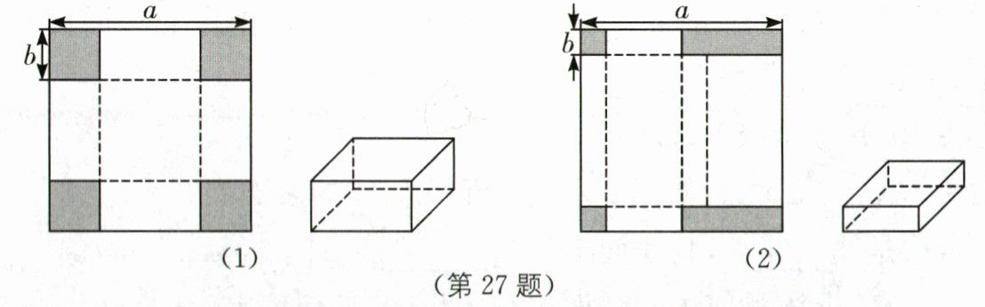 27.(12 分) 新情境 制作长方体纸盒 (2025·福建福州期末)某“综合与实践”小组开展了“长方体纸盒的制作”实践活动,他们利用边长为 24 cm 的正方形纸板制作出两种不同方案的长方体盒子(图(1)为无盖的长方体纸盒,图(2)为有盖的长方体纸盒),请你动手操作验证并完成任务.(纸板厚度及接缝处忽略不计)