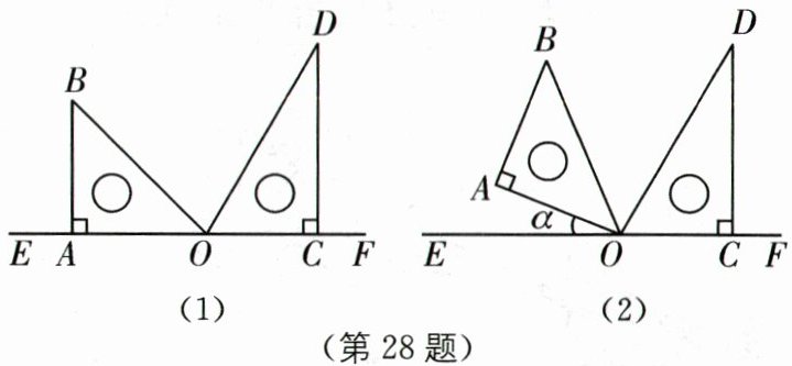 (2)在探究过程中,爱动脑筋的小明想起了图形的运动方式有多种. 如图(1),他先用三角板画出了直线EF,然后将一副三角板拼接在一起,其中$45^{\circ }角(∠AOB)的顶点与60^{\circ }角(∠COD)$的顶点互相重合,且边OA,OC都在直线EF上. 如图(2),固定三角板COD不动,将三角板AOB绕点O按顺时针方向旋转一个角度α,当边OB与射线OF第一次重合时停止.