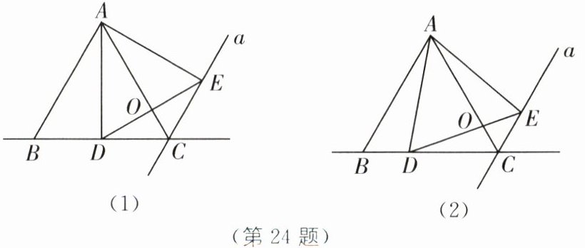 24. (12分)如图,△ABC为等边三角形,直线a//AB,D为直线BC上任一动点,将一60°角的顶点置于点D处,它的一边始终经过点A,另一边与直线a交于点E.
