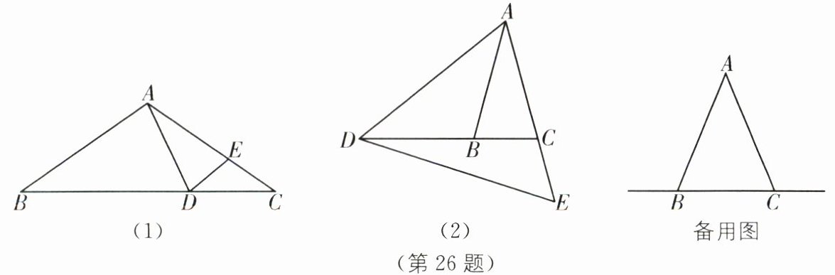 26. (14分)如图,在△ABC中,∠ABC= ∠ACB,点D在BC所在的直线上,点E在射线AC上,且AD= AE,连接DE.