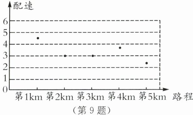 9.(2024·常州中考)在马拉松、公路自行车等耐力运动的训练或比赛中,为合理分配体能,运动员通常会记录每行进1 km所用的时间,即“配速”(单位:min/km).小华参加5 km的骑行比赛,他骑行的“配速”如图所示,则下列说法中错误的是(