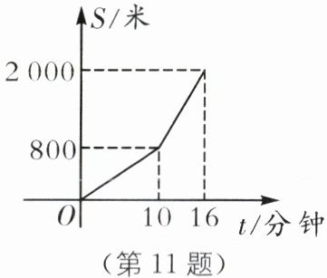 11.(2024·资阳中考)小王前往距家2000米的公司参会,先以$v_{0}$(米/分)的速度步行一段时间后,再改骑共享单车直达会议地点,到达时距会议开始还有14分钟,小王距家的路程S(单位:米)与距家的时间t(单位:分钟)之间的函数图象如图所示.若小王全程以$v_{0}$(米/分)的速度步行,则他到达时距会议开始还有______