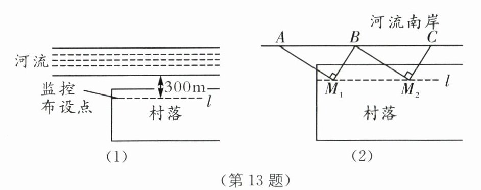 13.(2025·常州武进区期中)为保护河流旁的村落,做好防汛工作,某水利部门准备在河流旁设置防汛监控器.如图(1)所示,监控布设线l距离河流300 m,最大旋转角度90°;村落位于河流南侧,与河流邻接长度5000 m;任意两个监控器布设点之间的距离相等.小张设计了如图(2)所示的方案,AB为监控器$M_1$监测范围,BC为监控器$M_2$监测范围$,AM_1⊥BM_1,BM_2⊥CM_2,$此时$BM_1= CM_2= 375 m;$若按此方案进行布设,该水利部门至少需要布设______个监控器.