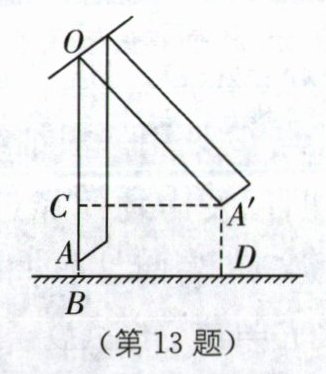 13. (2024·四川巴中期末)在《算法统宗》中有一道“荡秋千”的问题:“平地秋千未起,踏板一尺离地.送行二步与人齐,五尺人高曾记.仕女佳人争蹴,终朝笑语欢嬉.良工高士素好奇,算出索长有几.”此问题可理解为:如图,有一架秋千,当它静止时,踏板离地距离AB长度为1尺.将它往前水平推送10尺,即A'C= 10尺,则此时秋千的踏板离地距离A'D就和身高5尺的人一样高.若运动过程中秋千的绳索始终拉得很直,则绳索OA的长为______尺.
