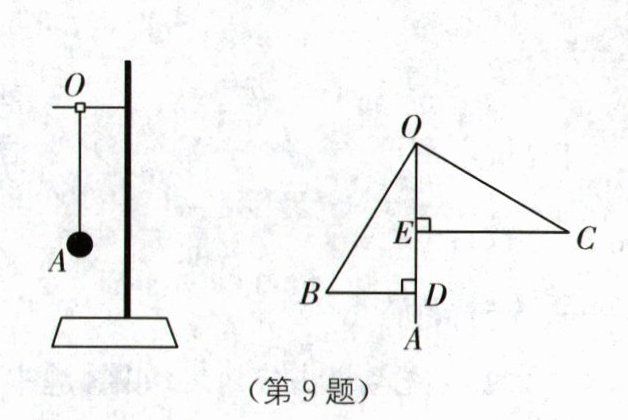 9.(2024·河北保定高阳期末改编)小明在物理课上学习了发声物体的振动实验后,对其作了进一步的探究:在一个支架的横杆点O处用一根细绳悬挂一个小球A,小球A可以自由摆动,如图,OA表示小球静止时的位置.当小明用发声物体靠近小球时,小球从OA摆到OB位置,此时过点B作BD⊥OA于点D,当小球摆到OC位置时,OB与OC恰好垂直(图中的A,B,O,C在同一平面上),过点C作CE⊥OA于点E,测得CE= 15 cm,AD= 2 cm.