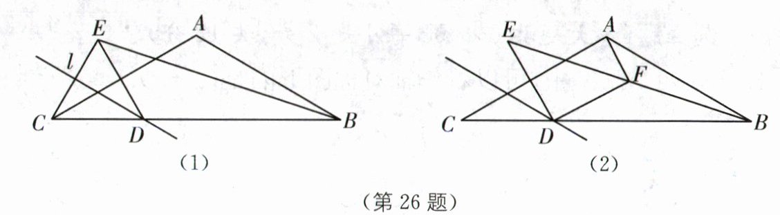26. (10分)在$△ABC$中,$AB= AC,∠ABC= α$,点D是边BC上一动点,过点D作$l// AB$,点E与点C关于直线l对称,连接DE,BE.